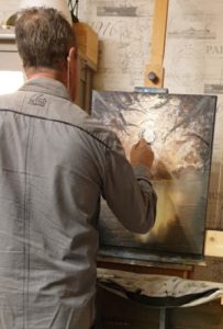 Het begon voor Henk allemaal bij Bob Ross, een Amerikaanse landschapschilder die furore maakte op de televisie met zijn serie “Joy of Painting”. Met een mengeling aan verfkleuren, een schildersezel en een paar penselen kwamen de eerste streken op het doek volgens de instructies van Bob Ross op video’s en lesmateriaal. Inmiddels heeft de Soesterberger de getalenteerde Bob Ross losgelaten en maakt hij al enige tijd schilderijen of doeken volgens een eigen ontwikkelde stijl. Ook de verschillende schildercursussen, zoals bij Sylvia Kuiters te Zwijndrecht, hebben hem een zogezegde professioneel zetje in de rug gegeven.