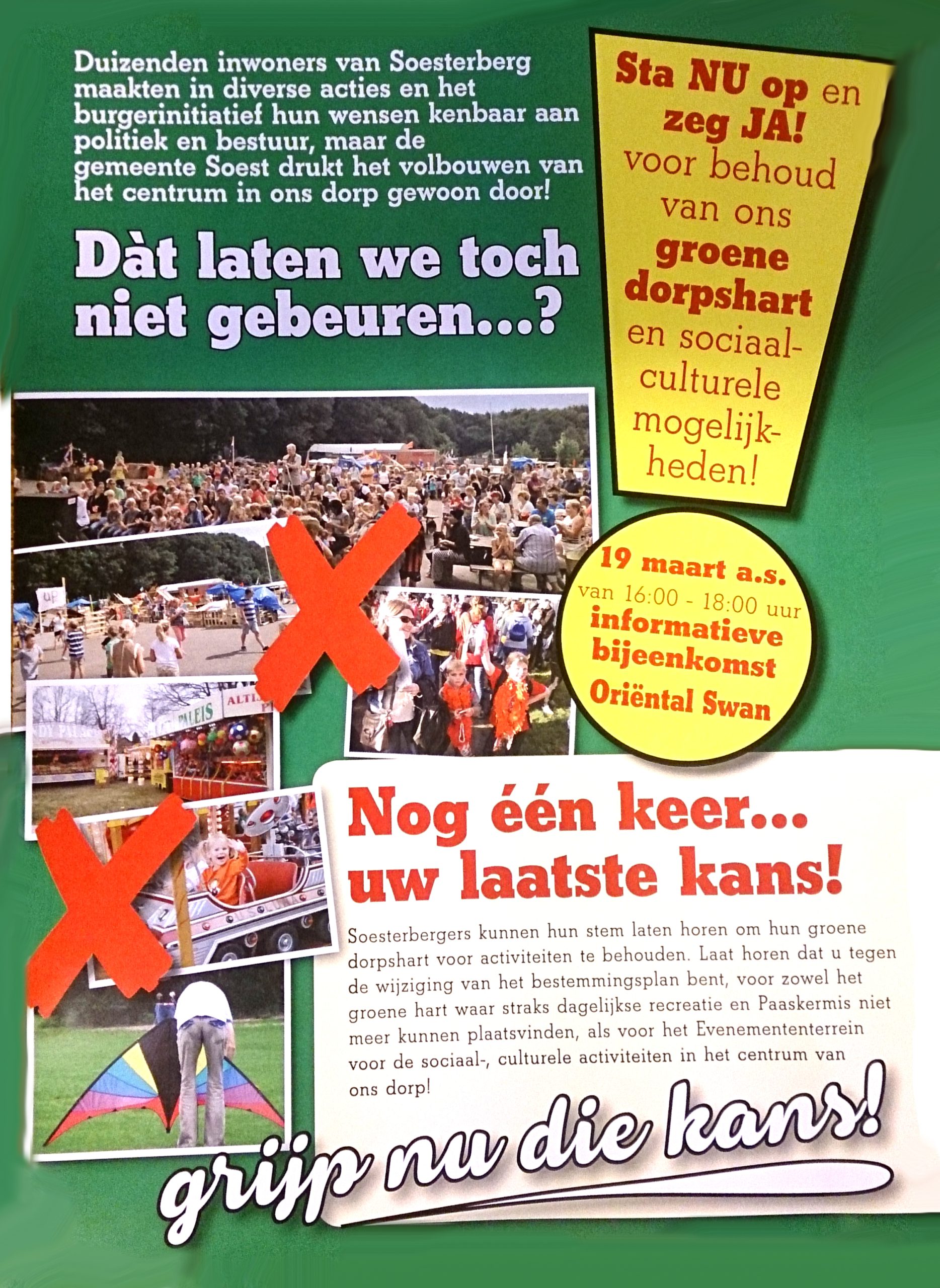 Een actiefolder van het burgerinitiatief Soesterberg, gericht aan alle inwoners van Soesterberg, met een duidelijke oproep om “Ja” te stemmen voor het behoud van het groene hart met voorzien de sociaal culturele mogelijkheden in ons dorp.