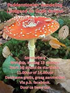 De wandelingen vinden plaats op zondag 19 oktober en starten om 11.00 uur en 14.00 uur bij basisschool De Startbaan aan de Oude Tempelweg in Soesterberg. Onder begeleiding van een gids ontdekken deelnemers de vele soorten paddenstoelen en andere bijzondere flora en fauna die in het bos leven. De deelname is gratis en de tocht duurt ongeveer twee uur.