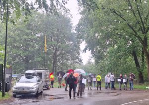 Bij aankomst werden bezoekers geconfronteerd met een wegversperring bij de ingang, opgezet door demonstranten. De toegangsweg werd geblokkeerd, wat resulteerde in een lange rij voertuigen buiten het terrein. Een handjevol politieagenten, zowel in uniform als in burger, en surveillerende politieauto’s en Koninklijke Marechaussee waren aanwezig om de situatie te beheren. Ondanks de spontaan ingevlogen aanwezigheid van de actiegroep Extinction Rebellion, bleef de demonstratie gisterenavond vreedzaam in Den Dolder.