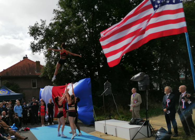 Naast de inhoudelijke toespraken waren er tussentijds optredens van de Zero Cheerleading uit Zwolle en als finale afsluiter het Nederlands en Amerikaans volkslied. Het SAM monument werd plechtig ontdaan van een statig drie kleuren doek, waarna een luid applaus volgde van ruim tweehonderd bezoekers richting met name het comité van SAM die jaren achtereen hebben volgehouden en geloofde in de realisatie van dit bijzondere monument op de overkluizing in Soesterberg. Het hele verhaal en de gedachten over dit bijzondere monument kun je beluisteren via je mobiel middels QR-codes op verschillende plaatsen aangebracht op de stalen verbeeldingen van het monument. Mocht je in de buurt zijn, dan is het zeker de moeite waard!