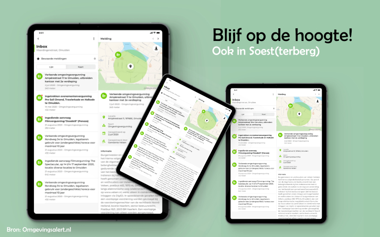 Gemeente Soest is deze week aangesloten op de OmgevingsAlert App. In de App kunnen inwoners precies zien welke vergunningsaanvragen er binnen zijn gekomen bij de gemeente. En welke besluiten de gemeente Soest neemt over bijvoorbeeld een bestemmingsplan, een vergunning voor een evenement of een verbouwing bijvoorbeeld. De App, die gratis te downloaden is via de gebruikelijke stores, is een aanvulling op de wekelijkse bekendmakingen in de krant en de website www.overheid.nl.