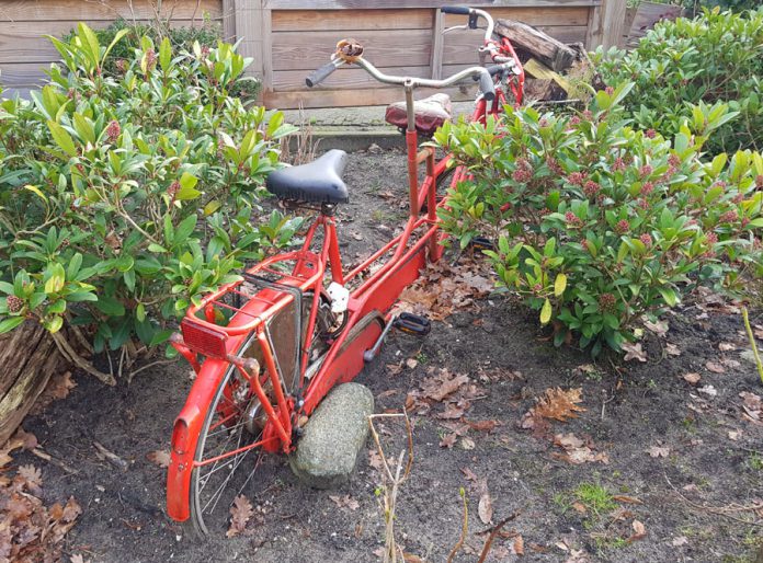 Inno Rutting heeft de tandem te leen gekregen van een plaatselijke ondernemer en samen met de fietsenmaker de tandem volledig opgeknapt voor de grote fietstocht vanaf Seedorf (D). De tandem moest overigens nog wel even uitgegraven worden, want de enigszins roestige leen-tandem deed in eerste instantie dienst als “promotie” voor de ingang van het restaurant.