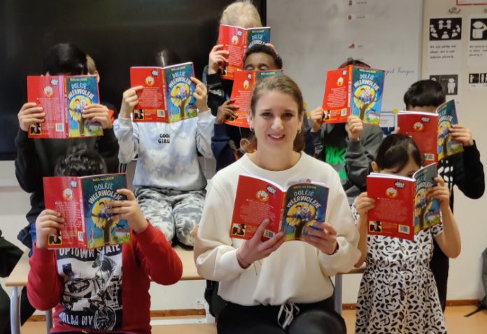 De wethouder was op bezoek bij groep 5 van de basisschool en het jeugdboek dat werd uitgereikt afgelopen vrijdag was Dolfje Weerwolfje van Paul van Loon.