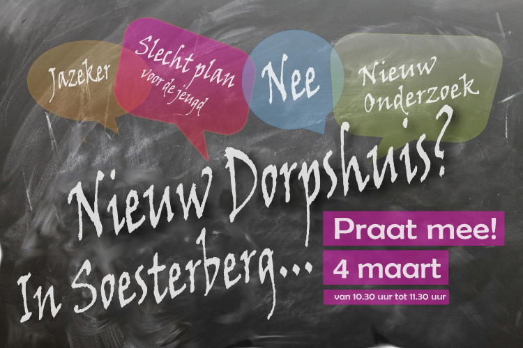 Wil je ook mee discussiëren over de beoogde plannen en weten waarom deze volksvertegenwoordigers zeer kritisch zijn tegenover het voorgenomen raadsvoorstel? Kom dan morgenvroeg van 10.30 uur tot omstreeks 11.30 uur naar het plein voor de Plus van Soest. Laat je overtuigen of informeren over de huidige stand van zaken en het langverwachte Dorpshuis.