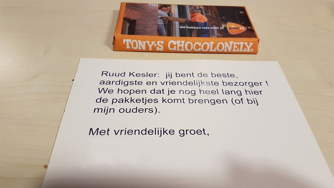 “Ik heb 10 jaar lang met ontzettend veel plezier en passie pakketten bezorgd in Soesterberg. Per 1 mei 2019 zal ik mijn vaste route op moeten geven. Ik heb hier veel verdriet van, maar helaas ook geen invloed op. Ik wens mijn vaste klanten goede dienstverlening toe in de toekomst. Ik hoop op vervangers die dit werk net zo accuraat en vol gedrevenheid zullen uitvoeren als ik de afgelopen 10 jaar gedaan heb.”, aldus Ruud Kesler op zijn Facebookpagina.