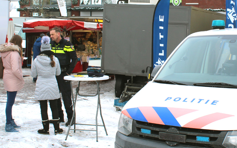 De gezamenlijke stand bleef niet onopgemerkt op de Soesterbergse markt, want een opvallende politieauto, statafels, folders en enkele promotievlaggen waren uit de kast gehaald om goed op te vallen. Buiten de wijkagent en de verbindelaar waren ook de maatschappelijke organisaties “Buurt bemiddeling” en “Welzin” aanwezig om in gesprek te gaan met inwoners uit Soesterberg.