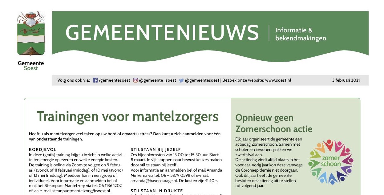 Ook online is de huis-aan-huis krant en daarmee de gemeentelijke informatiepagina altijd te lezen via: https://www.soestercourant.nl/Krantenarchief (de rechter is de huis-aan-aan krant).