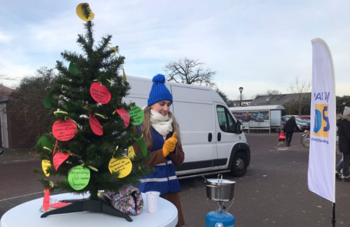 In de vrieskou je politieke boodschap verkondigen en verspreiden, dan moet je veel voor je dorp over hebben. Vandaag waren enkele leden van de politieke partij POS op het plein voor de supermarkt om met inwoners te praten over uiteenlopende wensen en behoeften voor het dorp. Wensen en ideeën werden opgeschreven op een papieren kerstbal en aan een kerstboom gehangen, in de hoop dat de kerstman ze deze dagen zal komen ophalen.