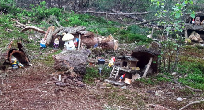 Tot in de details hebben enkele creatieve bewoners een groot kabouterdorp gebouwd met paddenstoelhuisjes, ‘echte’ kabouters, egels en miniatuur boomhutten gemaakt van boomtakken en schors. Aan de opstelling van de huisjes te zien is het 24/7 een gezellige boel, want de huisjes staan gezellig in een kringetje met een grote paddenstoel en een lampje op zonenergie in het midden. De inwoners van het kabouterdorp hebben blijkbaar net inkopen gedaan in het bos, want het kabouterplein ligt nog vol met verse dennenappels.