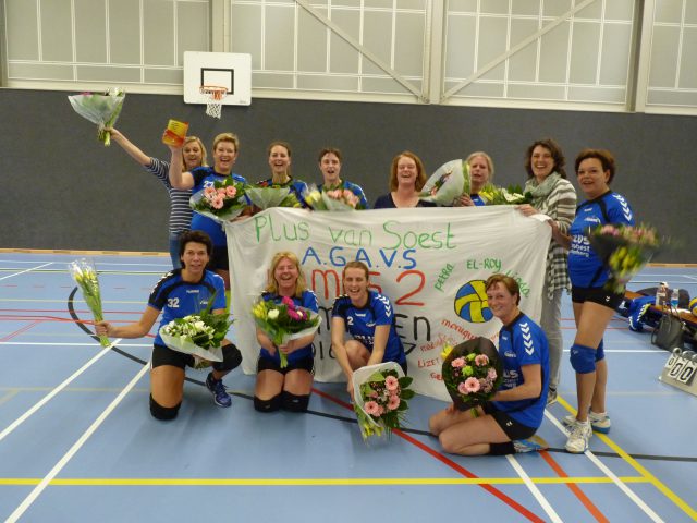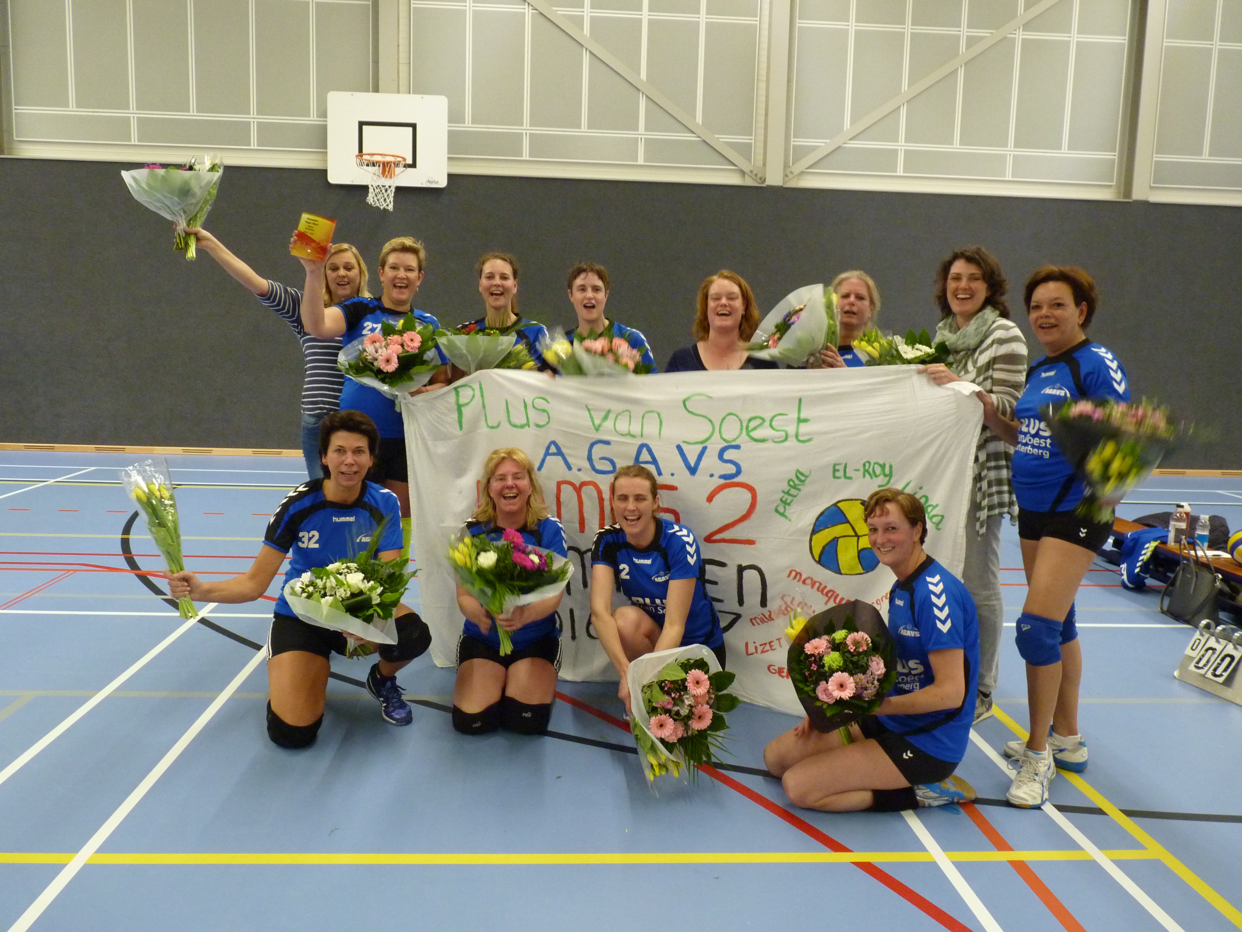 Om het kampioenschap binnen te kunnen halen moesten er drie punten behaald worden. Met de nodige zenuwen werd aan de wedstrijd tegen Unicornus D4 begonnen. Al gauw bleek de wil om te winnen aanwezig en werd de 1e en 2 set gewonnen met 25-7. Met de champagne al in het vooruitzicht werd de 3e set afgesloten met een …winst van 25-15 waarmee het kampioenschap een feit was en werd al op het veld met een vreugdedans afgesloten onder het toejuichen van een volle tribune. Ondanks dat het kampioenschap al binnen was pakte de Dames 2 Plus van Soest-AGAVS ook nog de 4e set met 25-13.