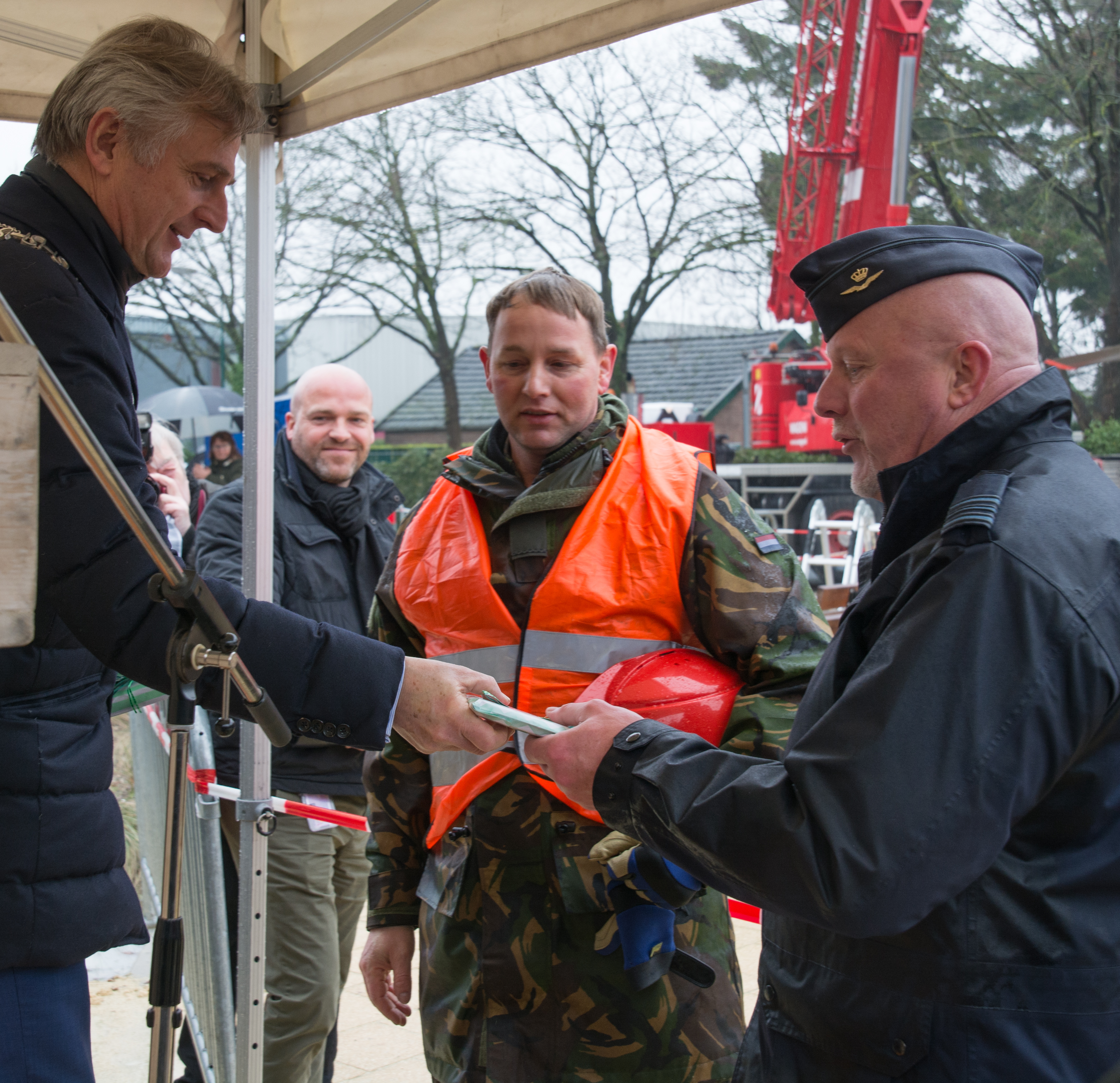 Ondanks het slechte weer en de straffe kou waren er veel inwoners komen kijken naar de plechtige onthulling en montage van de helikopter op de solide zwarte sokkel. Met groot materieel en een speciale hoogwerker ging de Koninklijke helikopter, dit keer niet op eigen kracht, de lucht in en werd de vliegmachine geplaatst op de sokkel met grote bouten en moeren.