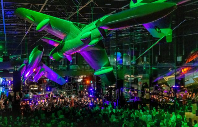 Een hoogtepunt van de avond is de voorstelling bij de Chinook-helikopter in het museum. De slagwerkers van het Orkest Koninklijke Luchtmacht spelen samen met de Zandtovenaar, Gert van der Vijver. Hij maakt live zandtekeningen die het muzikale verhaal ondersteunen.