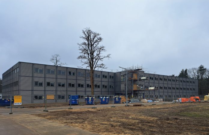 Op Kamp van Zeist begint het nieuwe onderkomen van het Centraal Orgaan Asielzoekers (COA) vorm te krijgen, de grijze hoogbouw units staan en aan de binnenzijde worden de laatste bouwwerkzaamheden verder afgerond.