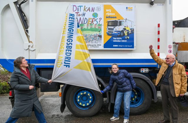 Onthulling poster Milieuprijs op vuilniswagen RMN