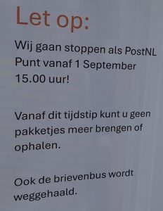 Per direct is er geen volwaardig postservicepunt meer beschikbaar in het dorp. Voor het ophalen of versturen van pakketten en brieven zijn inwoners voortaan aangewezen op vestigingen in Soest of Zeist.