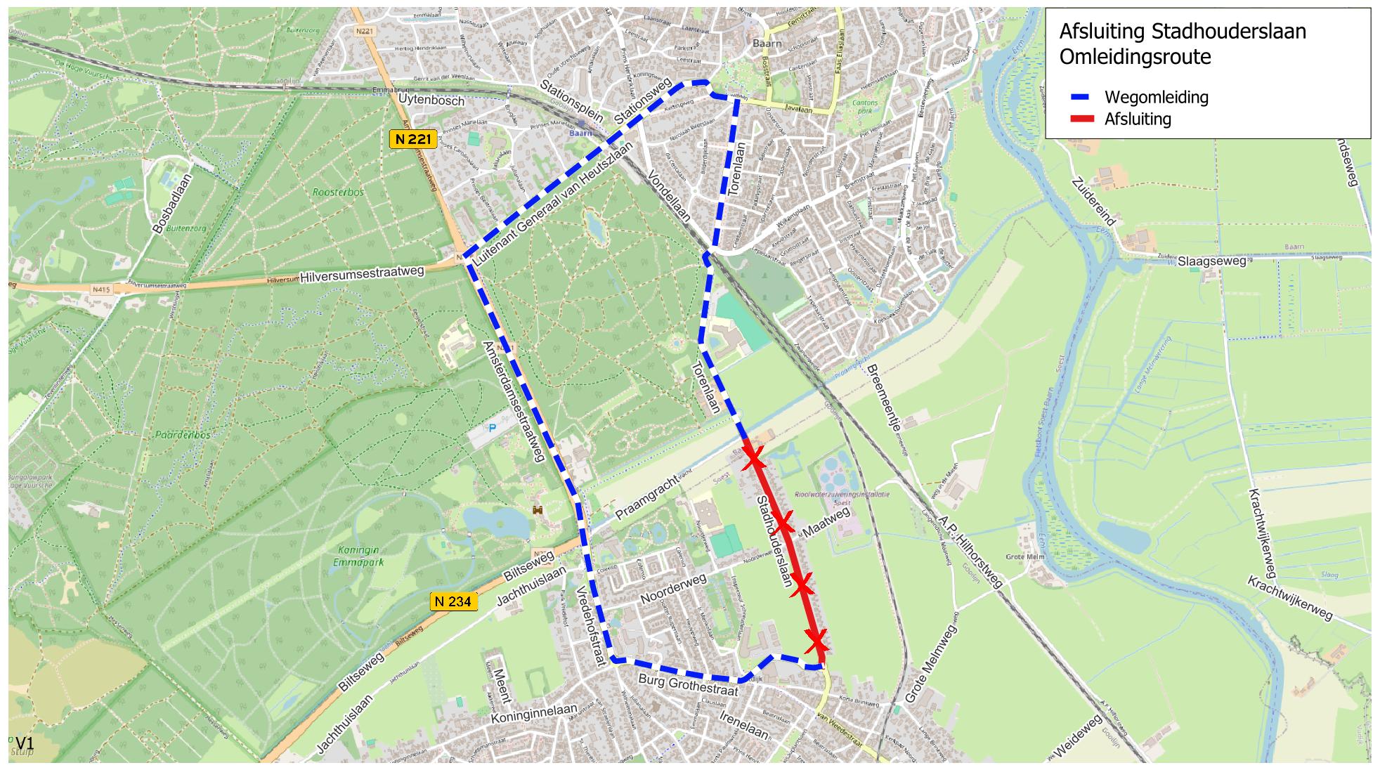 Om veilig te kunnen werken, wordt het doorgaande verkeer omgeleid. Alleen bewoners en hulpdiensten kunnen via slagbomen de straat in. Inrijden is alleen mogelijk vanuit de richting Baarn naar Soest. Bij noodgevallen kunnen de hulpdiensten ook de andere kant oprijden.