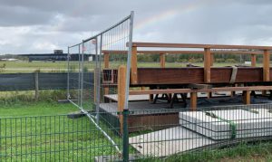 Afgelopen weekend was het voor enkele hondenbezitters zoeken naar een ander uitlaatterrein, want de delen van de houten loopbrug werden geleverd en opgeslagen op het honden-uitlaatterrein aan de rand van het vliegveld. Bewoners hadden geen enkel idee dat deze onderdelen bestemd waren voor de houten loopbrug en lieten dat ook weten op Facebook.