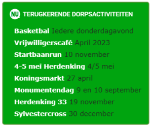 Om nog meer duidelijkheid te krijgen over de toekomstige activiteiten in het dorp hebben we sinds vandaag een nieuwe rubriek op onze website; “terugkerende dorpsactiviteiten”.
