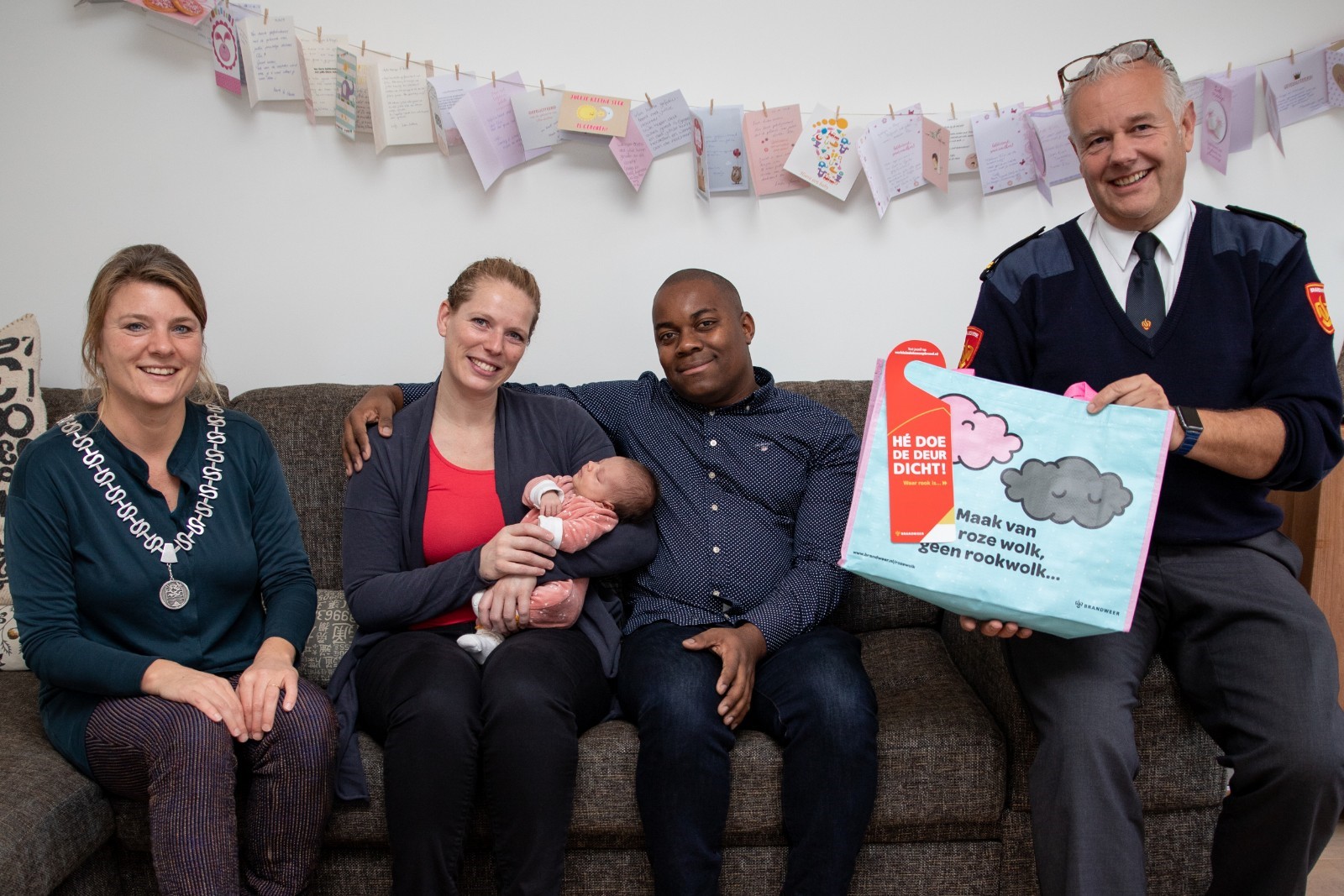 Loco-burgemeester Aukje Treep en Huub Peters van de Veiligheidsregio Utrecht spraken erover met het jonge gezinnetje. Als je kindje net geboren is, dan is brandveiligheid meestal niet het eerste waar je aan denkt. “De kraamverzorgster maakte ons er al wel attent op, dus tussen het verschonen van luiers en het voeden van onze kleine meid, was onze aandacht al een beetje gewekt.” zegt vader Spong. “Heel goed dat er op deze manier ook aandacht aan besteed wordt”.