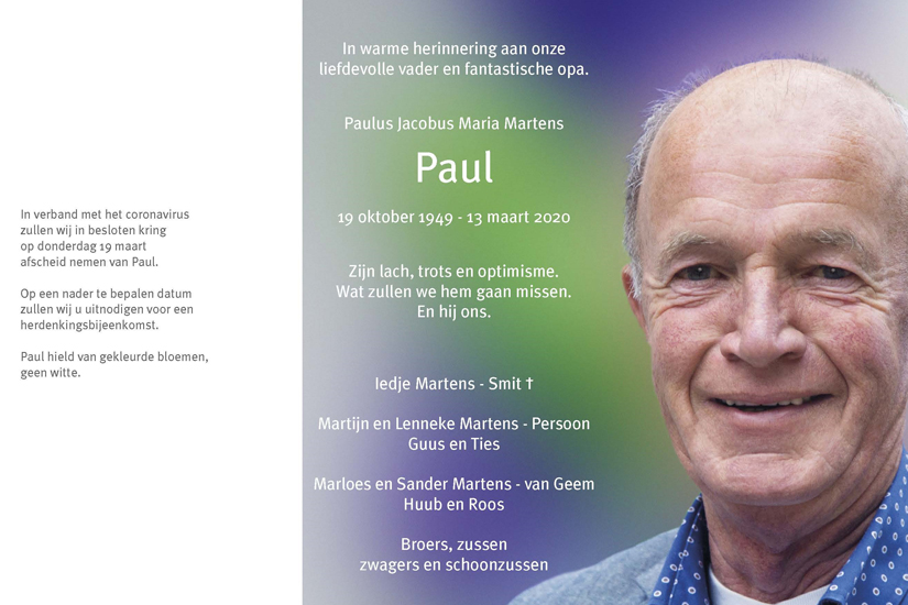 Maar toch kwam dit bericht nog onverwacht. We wensen zijn kinderen Martijn en Marloes, hun partners en kinderen heel erg veel sterkte bij dit verlies in deze moeilijke en onzekere tijden.