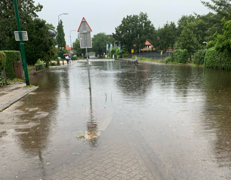 In het dorp zelf stonden veel straten blank en tuinplanten verdwenen als zon voor de zon uit de nieuw aangelegde tuinen. Ook sommige toegangswegen waren gewoonweg afgesloten, maar toch waren er enkele waaghalzen die er dwars doorheen gingen met de fiets of auto. De gevolgen van klimaatsverandering heeft Soesterberg gisterenmiddag aan den lijve ondervonden.