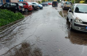 Verschillende weerberichten hadden het al aangegeven en donkere wolken pakten samen boven de Utrechtse Heuvelrug. Binnen enkele minuten was het letterlijk en figuurlijk bootje varen over de weg. Kinderen vonden het geweldig en spetterde elkaar nat met het koele regenwater in de wadi’s aan de Generaal Winkelmanstraat en speeltoestellen waren zonder natte voeten niet bereikbaar, want de klimrekken stonden half onder water.