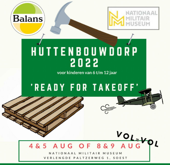 Twee dagen lang samen hutten timmeren! Hoe gaaf is dat?! Stichting Balans organiseert in samenwerking met het Nationaal Militair Museum in augustus twee keer een tweedaags Huttenbouwdorp. Het thema dit jaar is ‘Ready for takeoff’. 75 kinderen kunnen twee dagen lang hun creativiteit de vrije loop laten door samen een gave hut te bouwen. Daarnaast zijn er verschillende stoere sport- en spelactiviteiten.